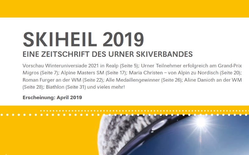 Alljährlich veröffentlicht der Urner Skiverband einen Rückblick über die abgelaufene Saison. Dies geschieht mit der Zeitschrift SKIHEIL. Die neuste Ausgabe 2019 ist erschienen. Spannende Artikel und Geschichten der abgelaufenen Saison können nachgelesen werden. Wer noch kein Skiheil hat, kann dies bestellen.